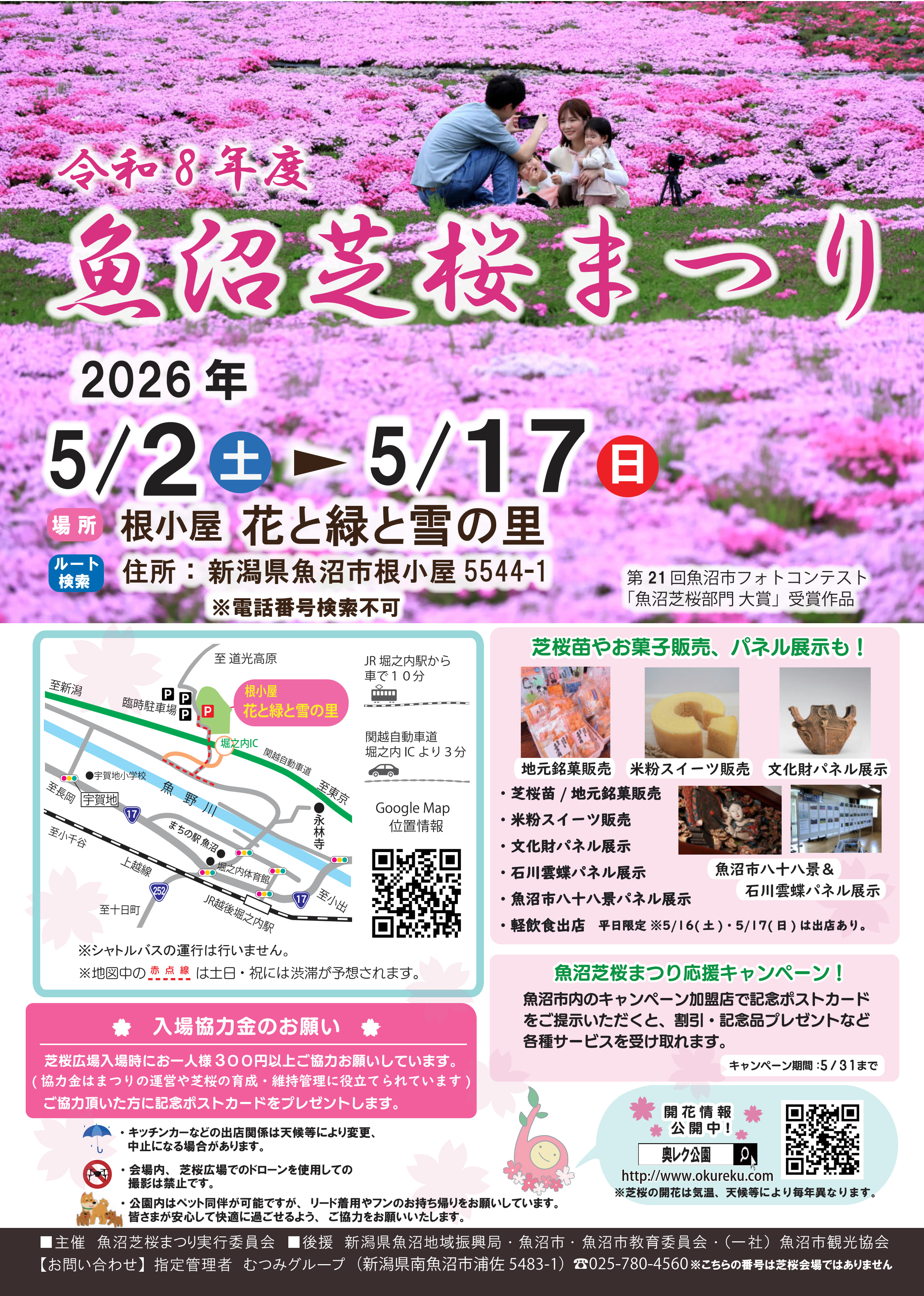 また、魚沼市内のキャンペーン加盟店にて各種サービスを受け取れる「魚沼芝桜まつり応援キャンペーン」も同時開催!!
