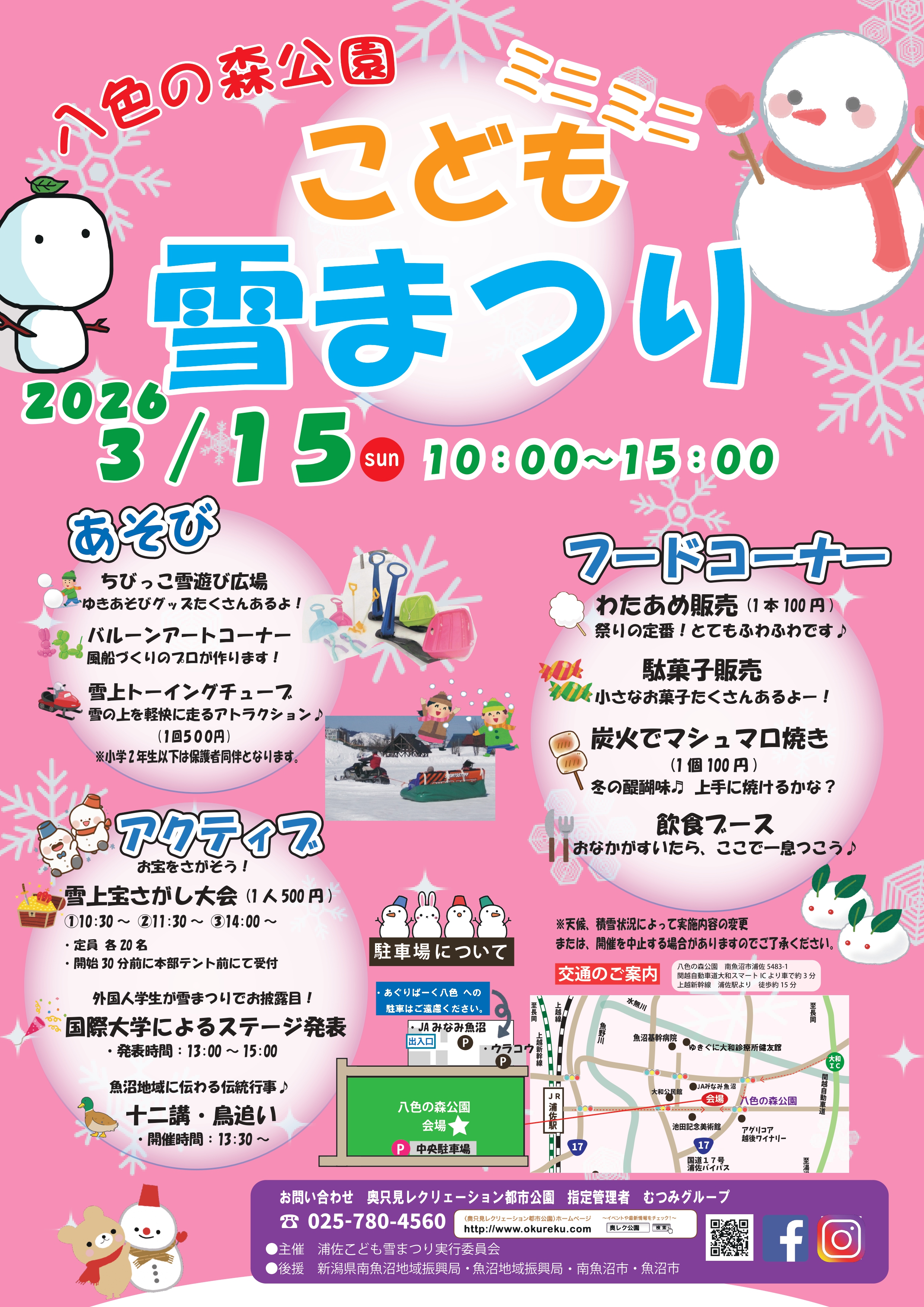 3/15(日) に八色の森公園にて「ミニミニこども雪まつり」が開催されます!