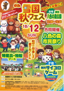10月12日、‘’雪国秋フェス‘’が開催されます🎵 当日は、八色の森市民まつりと同時開催! はたらく車の展示、物販ブースなど秋の楽しさが盛りだくさん! 当日、日本郵便キャラクター ぽすくまもくるよ♡